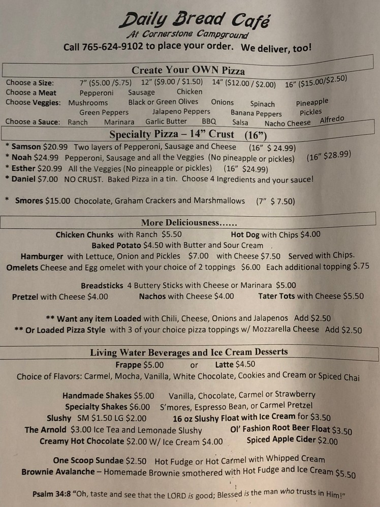 The Office, Camp Store, Arcade, and the Café are located at the Daily Bread. You will begin your visit at the Hospitality window at Cornerstone’s office. If you forget anything, our camp store is fully stocked with hygiene items, quick camp foods, RV supplies, and treats and snacks. A visit to our LIVING WATER Beverage center will quench your thirst with delicious slushy’s, Frappes, Lattes, hand-dipped shakes, and more! The Daily Bread café is open daily to provide you with the very best homemade camp food. Our homemade pizzas, shakes, desserts, and meals will be delivered right to your campsite. Call ahead and we will have it ready upon arrival.